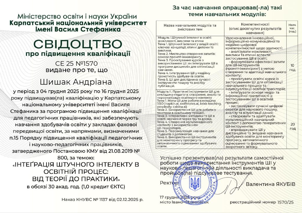 e-mail: a.shyshak@wunu.edu.ua, бульвар Т. Шевченка, 9, корпус № 10, каб. 21