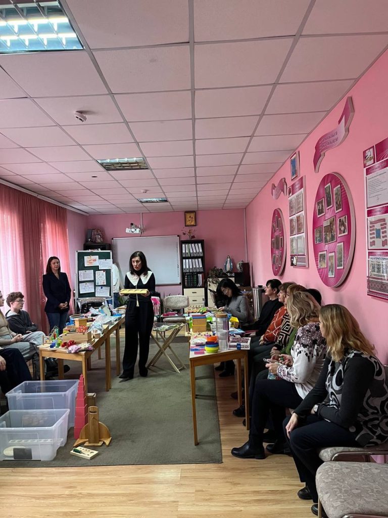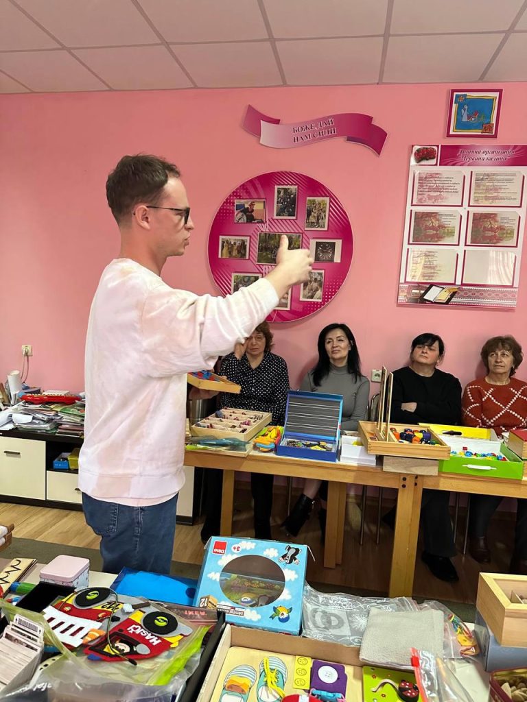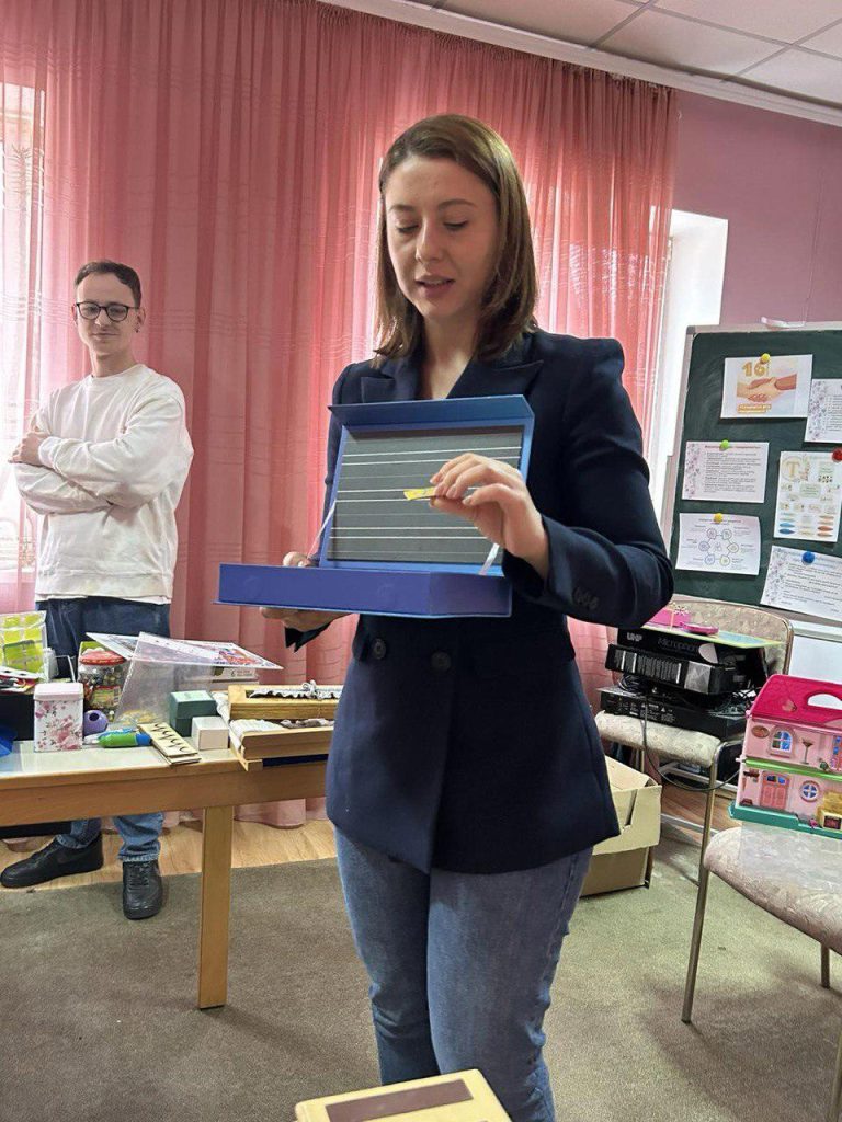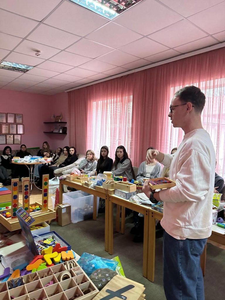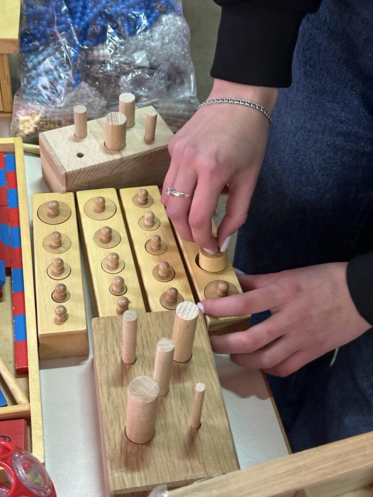 Педагогічний колектив навчально-реабілітаційного центру та студенти освітніх програм «Дошкільна освіта. Інклюзивна освіта» і «Початкова освіта» практично працювали з такими відомими Монтессорі-посібниками, як «Рожева піраміда», «Кольорові вежі Монтессорі», «Монтессорі-циліндри», «Підставка з кільцями», «Конструктивні трикутники, шестикутники, прямокутники», «Математичні штанги», «Геометричні тіла», «Шорсткі таблиці й цифри», «Рамки для шнурування та застібання» та інші.